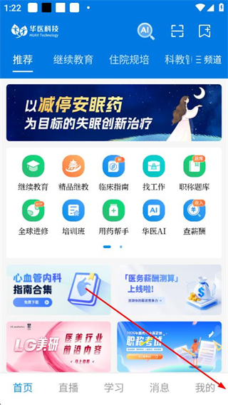 1、打开“华医科技”APP进入首页,找到继续教育功能入口点击进入,可浏览心血管内科指南合集及CME课程等内容,挑选适合的学习资料开展专业知识提升。