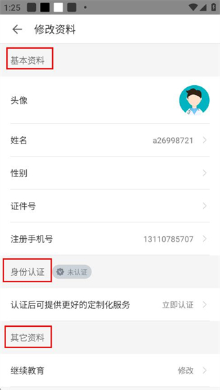 3、在修改资料页面,可对基本资料、身份认证、其它资料进行修改操作。