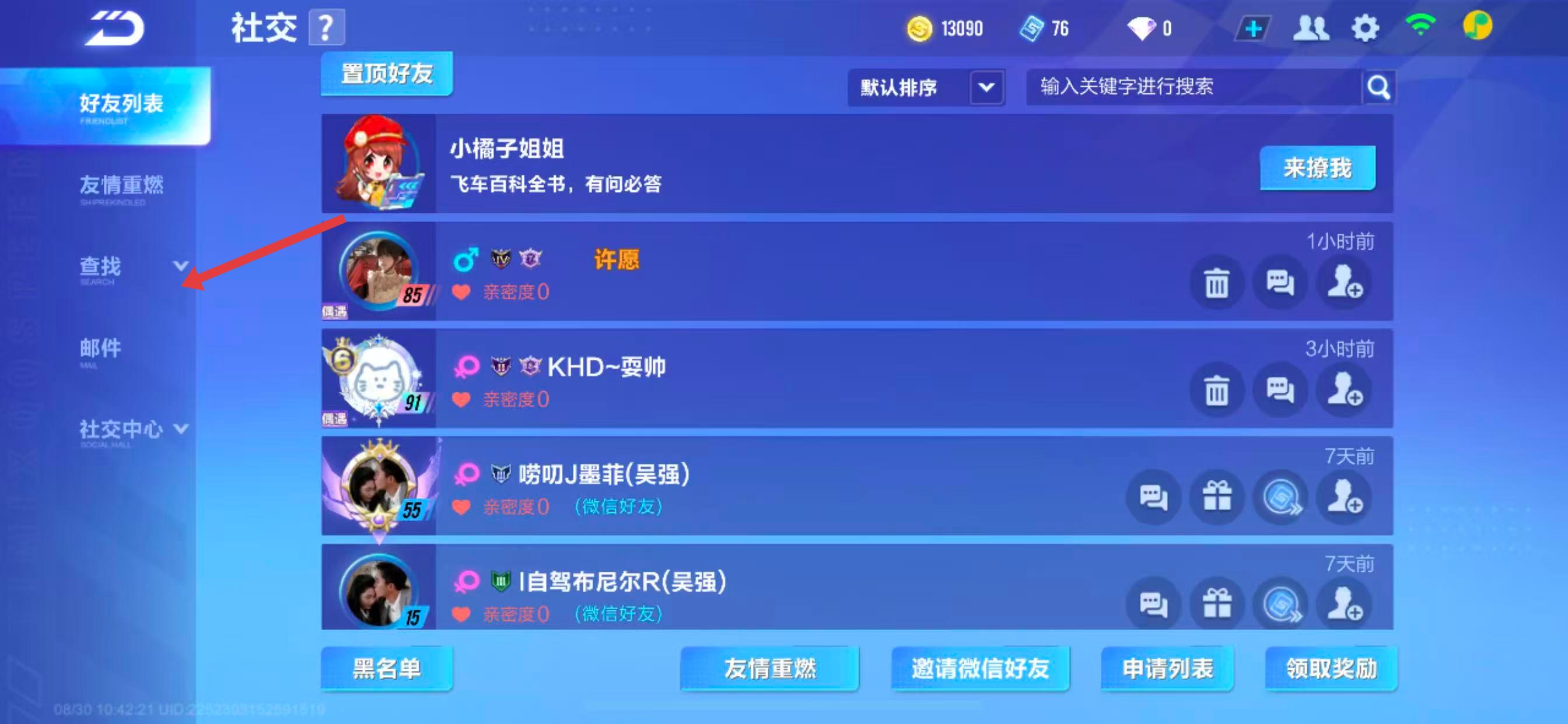 2、进入社交界面后,点击左侧菜单栏中的查找选项,在展开的下级菜单中选择查找玩家。