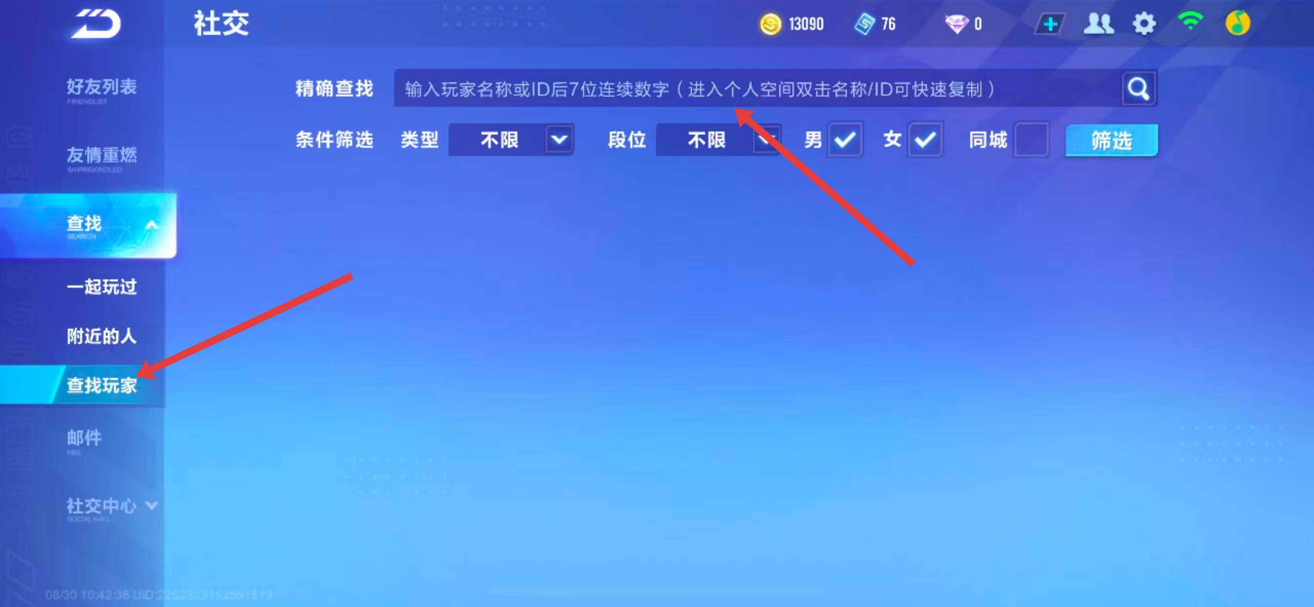 3、在精确查找栏中,输入玩家名称或ID后7位连续数字 ,即可成功添加好友。