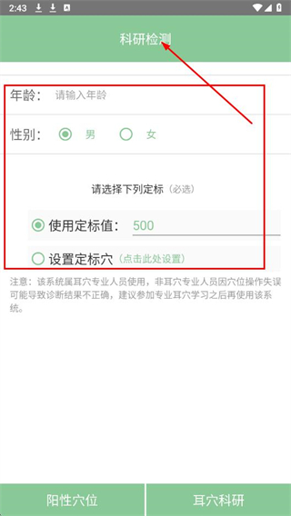 3、在科研检测板块,用户需要输入年龄、选择性别,并进行定标设置,如使用定标值或设置定标穴,为耳穴相关的科研工作提供数据支持。
