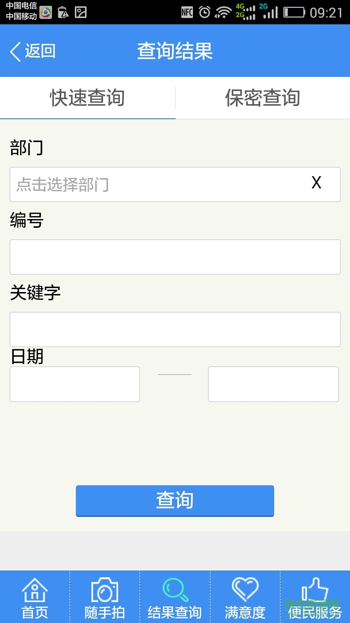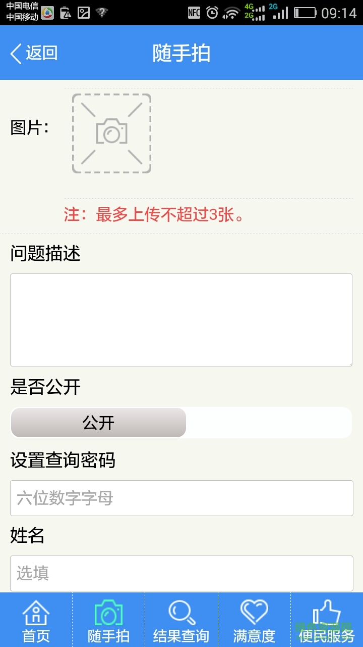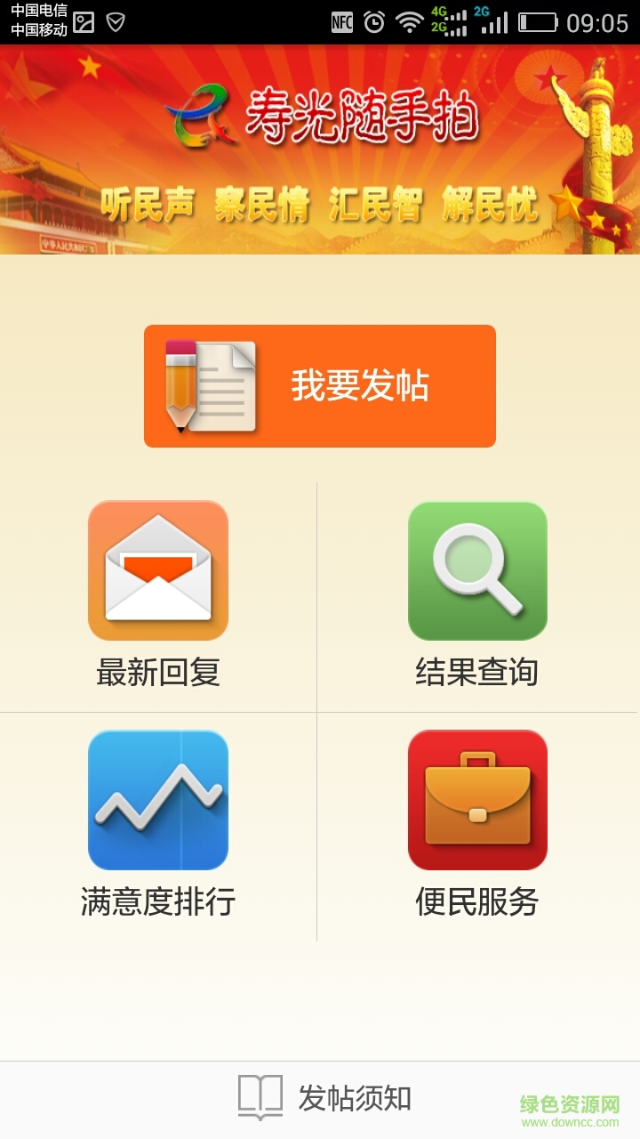 1.分为“我要发帖”“最新回复”“结果查询”“满意度排行”“便民服务”五个模块。
