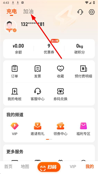 2、在该页面顶部,点击加油标签切换至加油功能页面。