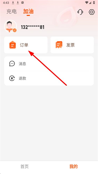 3、在加油页面中,找到订单选项并点击,进入加油订单的查看页面。