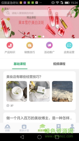 果本商学院软件是一款非常好用的美容护肤知识学习app,这里有丰富的课程知识,用户可以看详细的视频讲解,还可以进行肌肤的测试和详细的护肤方案,欢迎大家到绿色资源网下载使用!