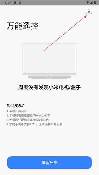 1、打开小米万能遥控应用,点击页面右上角的个人图标。