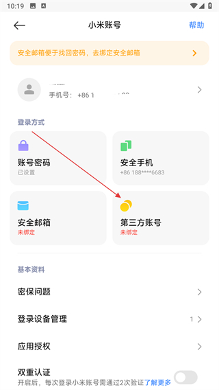4、找到第三方账号选项,点击该选项进入第三方账号绑定页面。