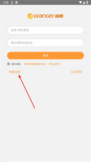 1、打开橙意健康app,在登录界面点击快速注册选项。