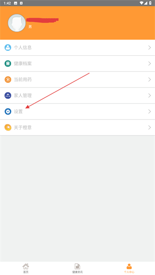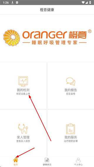1、打开橙意健康app,在首页点击右下角个人中心的图标。
