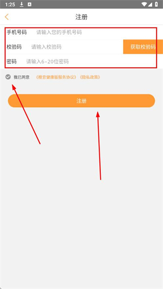 2、输入手机号码、校验码,设置密码,勾选同意服务协议和隐私政策,点击注册。