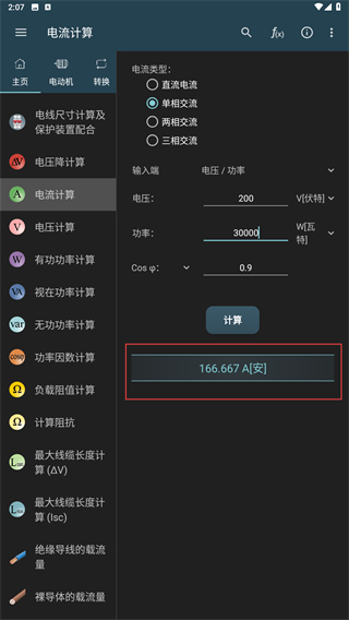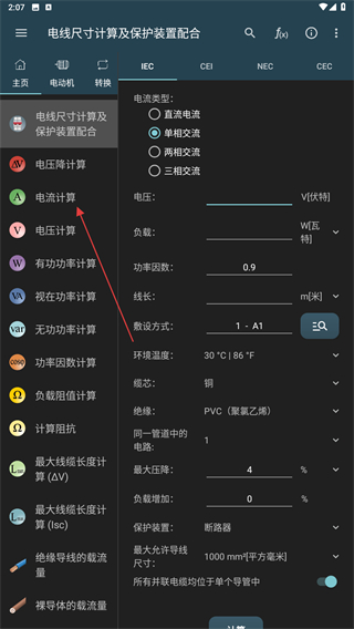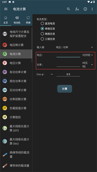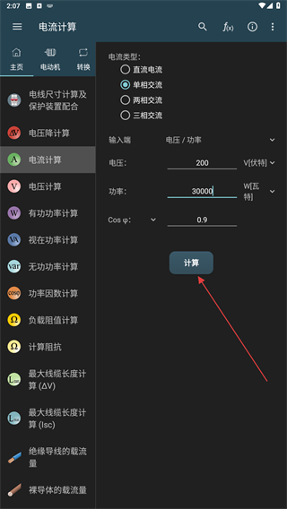 1、打开电工计算器APP,在左侧点击电流计算的按钮。