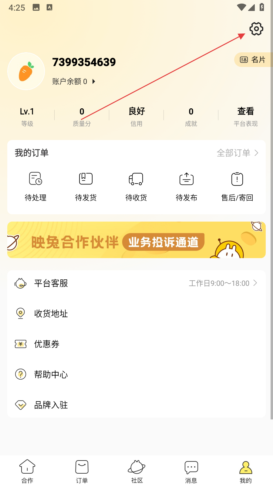1、打开映兔APP,进入我的页面,点击右上角的设置图标。