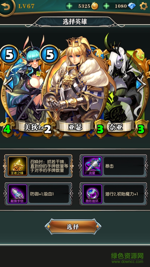 在竞技场中,首先需要决定围绕哪个英雄来构建自己的卡组。系统会从十位英雄中随机抽取三位英雄供玩家选择,大家可以从她们中挑选一名来进行卡牌构建,英雄的装备都是顶级装备。