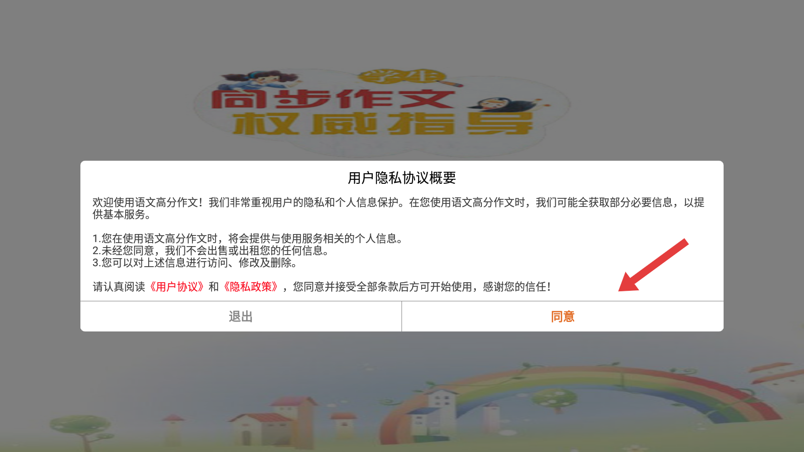 1、打开语文高分作文APP,阅读用户隐私协议概要后,点击同意按钮,进入应用主界面开始使用。