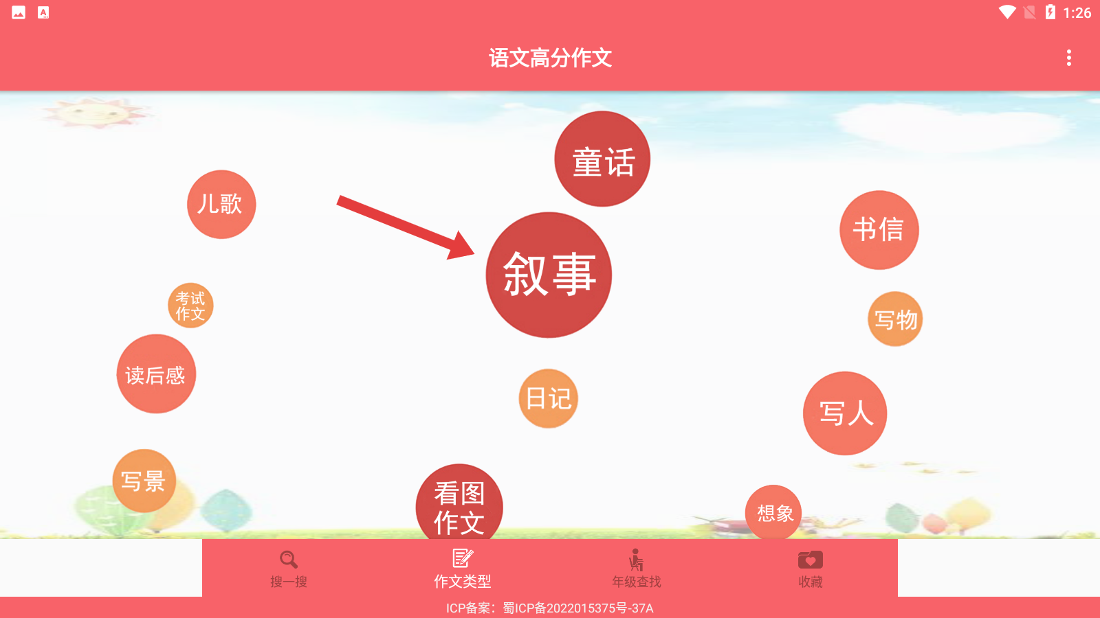 2、在应用作文类型页面,找到红色圆形的叙事选项并点击,进入叙事类作文内容浏览界面。