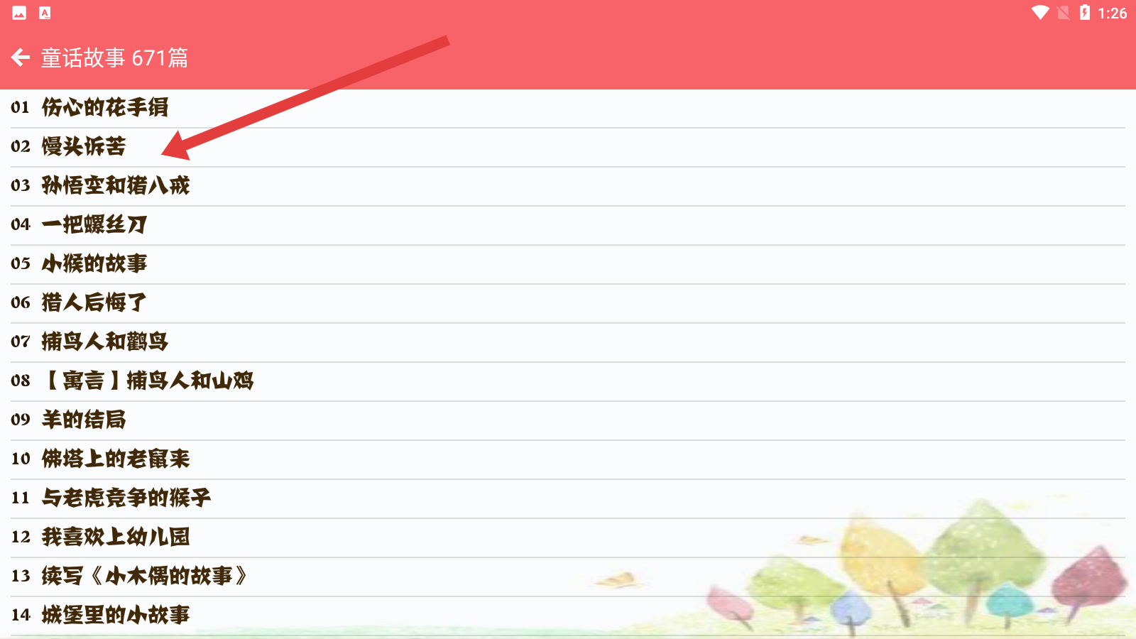 3、进入童话故事列表,点击序号02的馒头诉苦篇目,查看该童话故事的具体内容以获取写作参考。