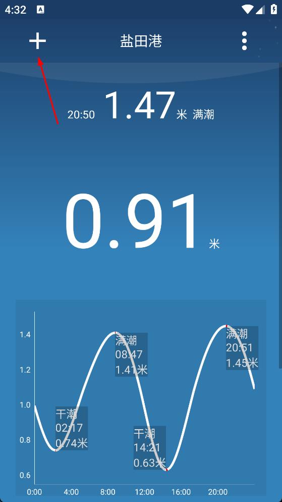 1、打开潮汐查询软件,点击页面左上角“+”号图标。