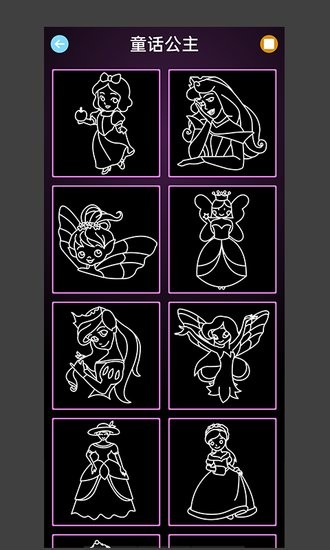 公主爱画画软件为用户带来更多的公主形象可以让用户进行绘画,许多儿童用户喜欢的迪士尼公主形象都可以在软件之中找到并学习绘画,用户还可以体验发光绘画的画画乐趣。