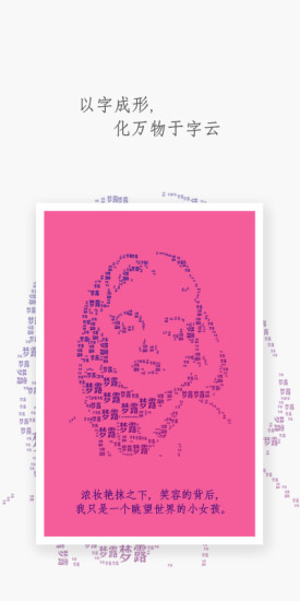 字云app是创意素材软件,将不同的字体,图片转化成丰富的图案,适用于不同的场景中,颜色、花体、背景、图形等都可以自行选择,发挥你的创意才能的时刻到了,不会告诉你,这是表白必备神器哦!