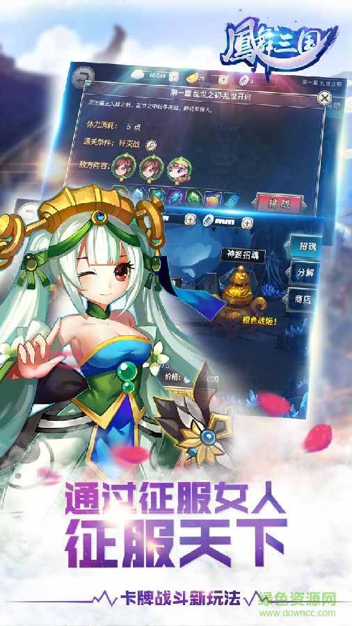 《凤舞三国》是一款三国人物题材的动作卡牌类游戏,游戏人物、场景融合Q版美术新画风。在风起云涌的三国时代出现了时空裂缝,迎来了魔族头领的突然入侵,大量的人受此影响变为了女儿身..大魔王与三国战姬激烈开战!魏、蜀、吴三国联合,全员出动!胜败与否,是人物?是组合?统统由你来支配!新颖的战斗场景、华丽的战姬技能,给你极致的游戏体验。多种多样的游戏活动,随心所欲的搭配与玩法,让你玩转一个全新的三国世界!