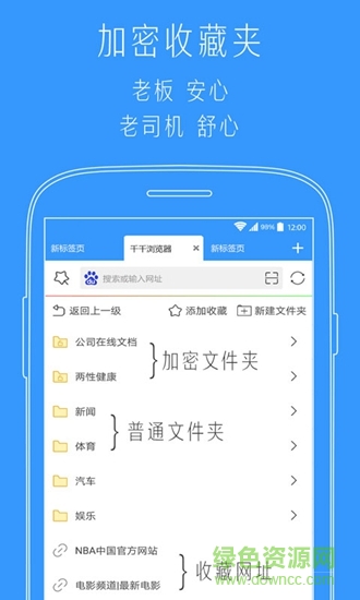 千千标签浏览器app是一款非常好用的手机浏览器,不同于一般浏览器,该浏览器具有众多新功能,支持文件夹加密功能,有效保护用户隐私,支持多文件同时下载,下载速度快稳定,欢迎来绿色资源网下载!