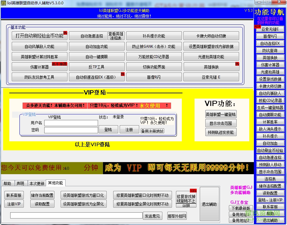 LOL英雄联盟自动杀人辅助是一款简单易用绿色的LOL辅助,辅助具有一键连击,无限视距,自动技能,自动躲避,技能补刀,风筝敌人等实用功能,有需要的朋友可以免费下载使用。