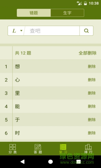 4.汉字通关:总共100级,可以逐级攀登,也可以跳级,还可以按照字频即常用性选择通关难度,错题自动进入错题本,点击"复习"按钮可以重做错题或复习生字,点击"排行"可以查看自己和别人的排名。