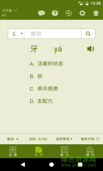 3.字典:每个字都有真人发音,点击题目汉字就能查看释义,多部字典任选,其中默认的另客字典提供一键加入生字本功能。
