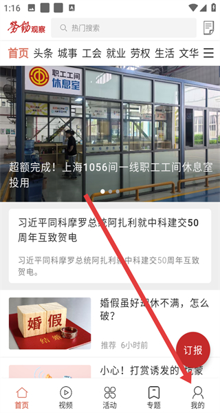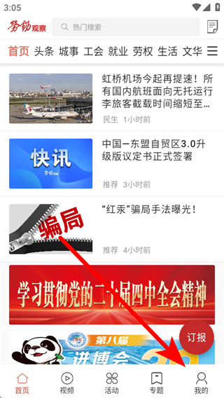 1、打开劳动观察APP首页,点击底部导航栏的我的,进入个人界面。