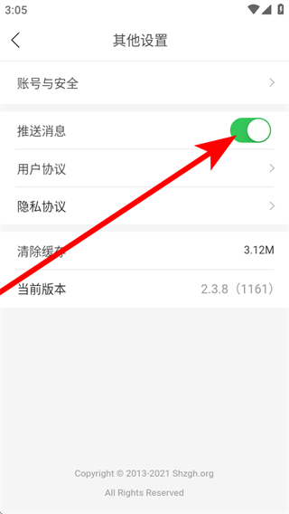 3、在其他设置页面,找到推送消息的开关,点击关闭完成关闭操作。