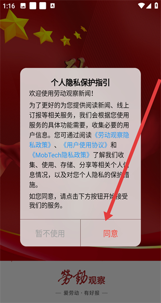 1、在打开App后,点击弹窗中的同意按钮,进入使用。