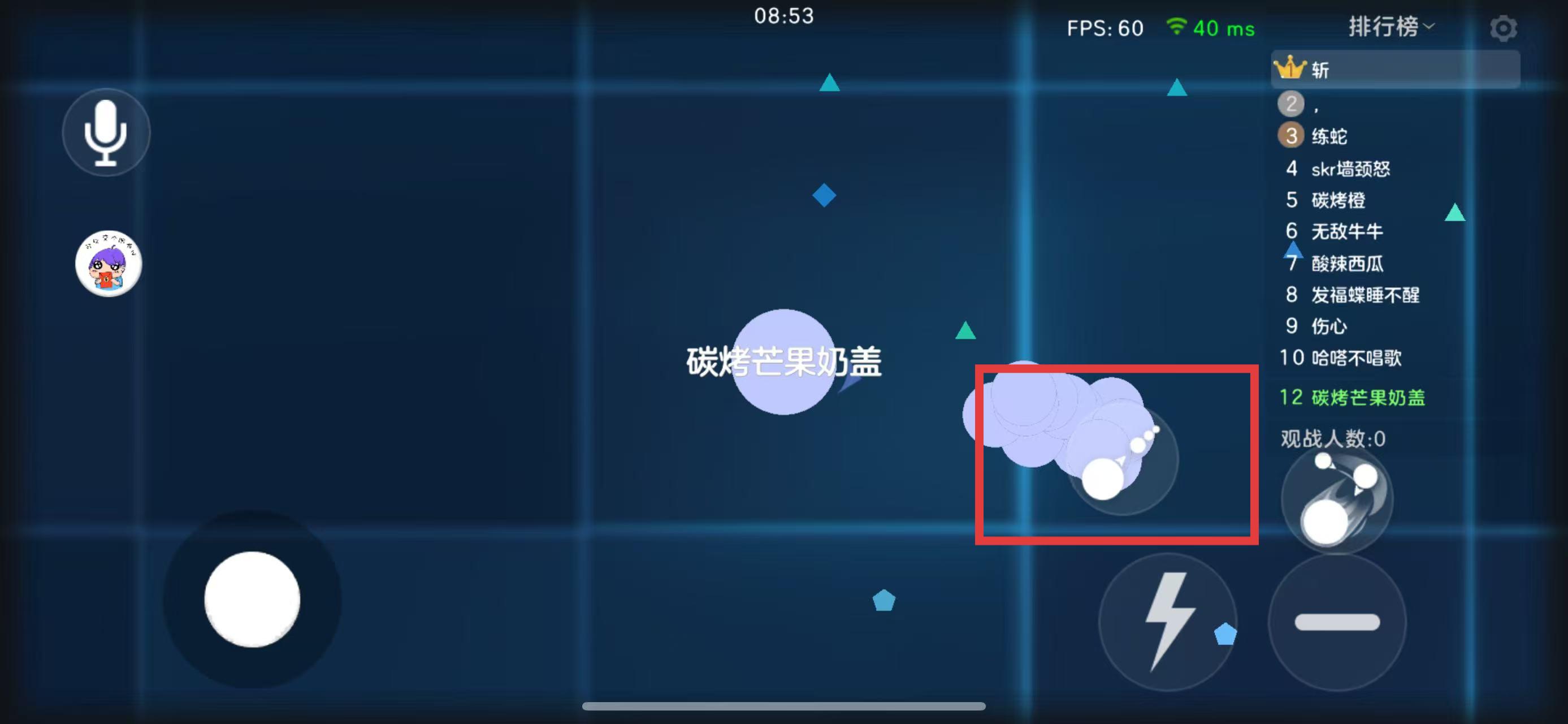3、进入游戏后,操控球球移动,利用屏幕按钮吐出孢子,通过吞噬他人或躲避他人吞噬,努力在规定时间内让自己的球球变大。