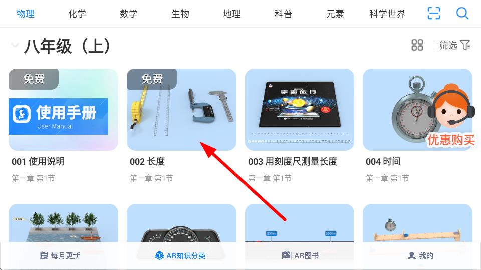 2、在AR知识分类页面中,找到想要学习的内容,比如点击002长度。