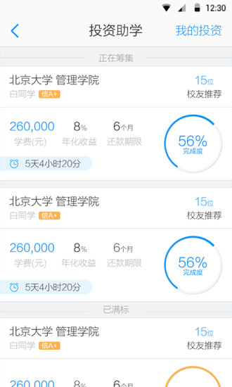 3.这是一款为职场人提供大学在职研究生、在职研修班、MBA深造等学习项目的分期缴费服务的移动应用。