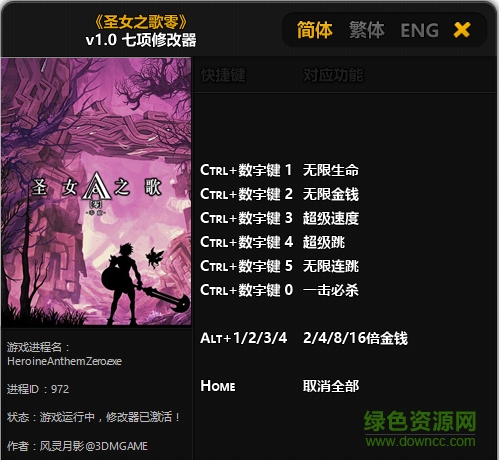 圣女之歌零七项修改器能够为玩家在《圣女之歌零》游戏中带了7种实用的功能,其中就包括有无限生命、无限金钱、无限连跳、一击必杀等,感兴趣的朋友可以来绿色资源网下载哦!