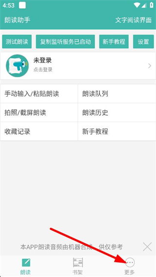 1、打开文字转语音朗读助手,点击导航栏的更多选项。