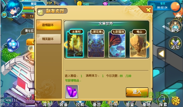 1、主界面点击“副本”图标进入副本大厅界面,选择“剧情副本”即可选择具体的副本;进入副本战斗,完成副本条件则成功通关;倒计时结束或者角色死亡则副本失败。