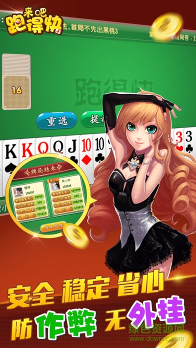 来吧跑得快游戏是一款好玩的扑克游戏,是大家休闲时间玩耍的首选游戏。这款游戏能给大家带来很多的欢乐,玩家可以和自己的朋友们约着一起打牌,也可以和网友们一起玩,精彩的棋牌游戏对决,喜欢的朋友就快来绿色资源网下载。