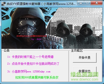 由叔YY频道强制卡麦神器是一款让你在YY频道上能抢麦、强制说话的工具,绿色软件无需安装,使用简单,需要的小伙伴就来绿色资源网下载吧!
