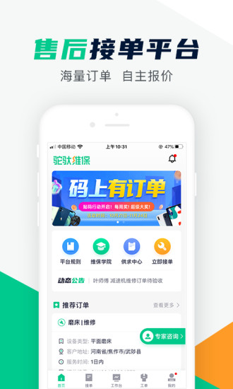 驼驮服务商APP是专门为工业设备售后团队打造的一款在线管理工具,帮助工业设备售后服务团队管理维保需求订单,团队伙伴;通过线上实时接单获得更多经济收入。