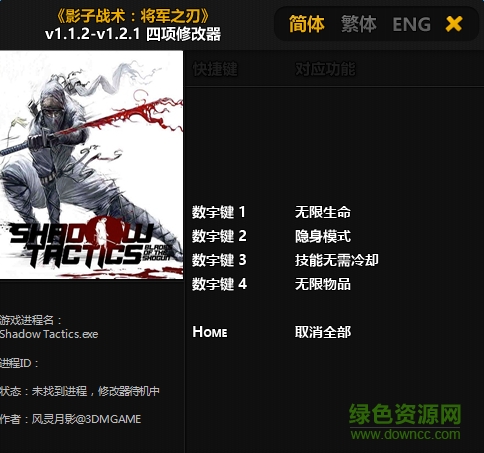 影子战术将军之刃四项修改器是一款提供四项实用功能的游戏辅助软件,其中就包括无限生命、隐身模式、技能无需冷却和无限物品,让你更加轻松的进行游戏,感兴趣可以来绿色资源网下载!