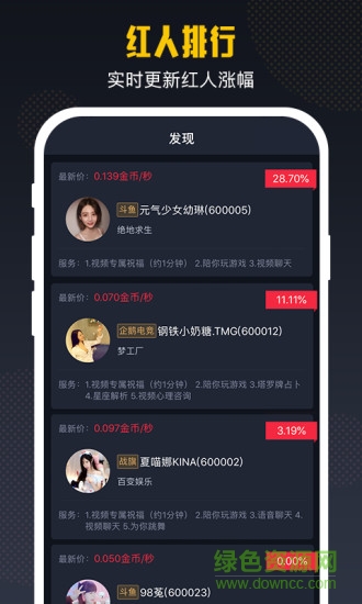 小葫芦红人坊是一款提供红人时间交易服务的平台,用户既可以在软件中认购并持有红人时间来获取不菲收益,也可以兑换成红人提供的私密服务。红人把未来的时间作为商品出售给广大粉丝,目前已经入驻的虎牙、斗鱼、YY、快手、B站、企鹅电竞等平台红人时间达255万+秒。粉丝购买的红人时间作为权益凭证,既能在平台消费时间行使服务,如专属视频祝福、为粉丝唱歌、陪粉丝玩游戏、视频聊天等,亦能通过低买高卖交易时间。入驻以来红人时间平均涨幅115%,部分涨幅达300%,不仅主播实现了流量变现,持有时间的粉丝也获得了巨大收益。
