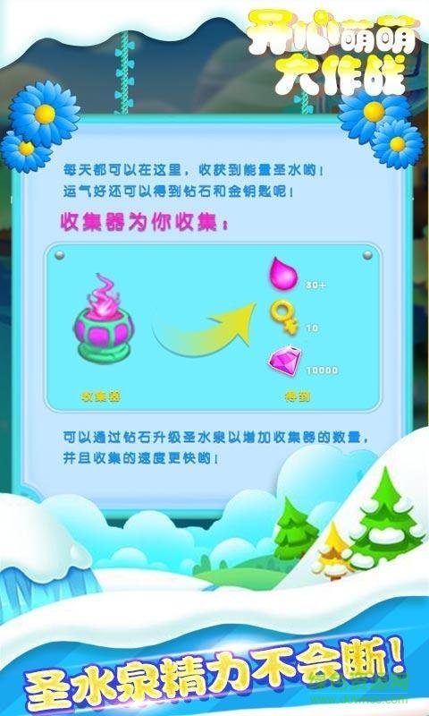 开心萌萌大作战是一款消除类游戏,在游戏里,萌宠们已经整装准备完毕,等待与你一起来一场紧张激情的冒险之旅。于限制的步数或时间内,将同色的萌宠联合消除,一次消除越多特效攻击性越强哟!最后达到游戏目标后,还有欢乐时光,释放大招,帮你得到更高分数。圣水泉是神秘大自然给你的丰厚礼物,还有冬季月赛陪你温暖过冬,招财猫就在那里等着你!