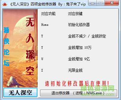 游戏介绍 游戏标签: 无人深空 游戏修改器 无人深空相关资料无人深空修改器无人深空补丁无人深空pc破解版 无人深空四项金钱修改器是一款专门针对游戏的金钱设计的一款修改器,有了它你就可以无限金钱了,但是要注意不要一次性把金钱值升到10亿以上,喜欢的朋友来绿色资源网下载吧!修改器说明:HOME 初始化修改器T 锁定当前金钱Y 金钱增加10万U 金钱增加 9亿I 无限金钱使用说明:1.解压文件2.启动游戏3.启动修改器注意事项:请勿一次性把金钱值升到10亿以上,超过后有可能会变成负数,请根据需求使用,建议控制在9亿范围内金钱数量! 游戏截图 上一张下一张(1 / 1) 安装详细截图 其他版本下载 标题 大小 更新日期 下载 下载地址 电脑版 无人深空四项金钱修改器 v1.0 最新版 点击报错 软件无法下载或下载后无法使用,请点击报错,谢谢! 关闭报错反馈 请描述您所遇到的错误,我们将尽快予以修正,谢谢! *必填项,请输入内容 本类最新 风灵月影管理器 v2.1.3 最新电脑版 黑神话悟空三十五项修改器 v1.0 正版免费 黑神话悟空风灵月影修改器 v1.0 最新版 GameBuff修改器PC端 v2..0.718.104 安装版 ce修改器绿色版(cheat engine) v7.4 官方最新版 鲁大师手机模拟大师 v7.3.3592.2470 官方版 相关文章 CE游戏修改器制作游戏修改器傻瓜教程 用户评论 热门评论 最新评论 发表评论 查看所有评论(0) 昵称: 请不要评论无意义或脏话,我们所有评论会有人工审核. 字数: 0/500 (您的评论需要经过审核才能显示)