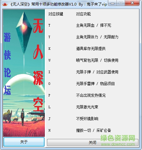 游戏介绍 游戏标签: 无人深空 游戏修改器 无人深空相关资料无人深空修改器无人深空补丁无人深空pc破解版 无人深空十项修改器可以帮助你在游戏中实现无限血、无限体力无限喷气背包、无限武器弹药等一些列功能,让你在游戏中是最强大的存在,喜欢的朋友赶紧来绿色资源网下载!修改器说明:T 主角无限血Y 主角无限体力U 无限喷气背包I 无限子弹O 无限手雷弹P 不会出现发热情况H 摧毁一切J 不受环境影响K 道具库存无限提供L 无限激光光束使用说明:1.解压文件2.启动游戏3.启动修改器 游戏截图 上一张下一张(1 / 1) 安装详细截图 其他版本下载 标题 大小 更新日期 下载 下载地址 电脑版 无人深空十项修改器 v1.0 绿色版 点击报错 软件无法下载或下载后无法使用,请点击报错,谢谢! 关闭报错反馈 请描述您所遇到的错误,我们将尽快予以修正,谢谢! *必填项,请输入内容 本类最新 风灵月影管理器 v2.1.3 最新电脑版 黑神话悟空三十五项修改器 v1.0 正版免费 黑神话悟空风灵月影修改器 v1.0 最新版 GameBuff修改器PC端 v2..0.718.104 安装版 ce修改器绿色版(cheat engine) v7.4 官方最新版 鲁大师手机模拟大师 v7.3.3592.2470 官方版 相关文章 梦幻西游怎么赚钱快 梦幻西游赚钱攻略2018 天使纪元大天使哪个好 天使纪元大天使选择介绍 CE游戏修改器制作游戏修改器傻瓜教程 解决无法直接启动原先xp系统 手工修改Boot.ini文件方法 误删文件不用愁 修改前的文件轻松找回 停用XP十项服务 让系统更有保障 用户评论 热门评论 最新评论 发表评论 查看所有评论(0) 昵称: 请不要评论无意义或脏话,我们所有评论会有人工审核. 字数: 0/500 (您的评论需要经过审核才能显示)