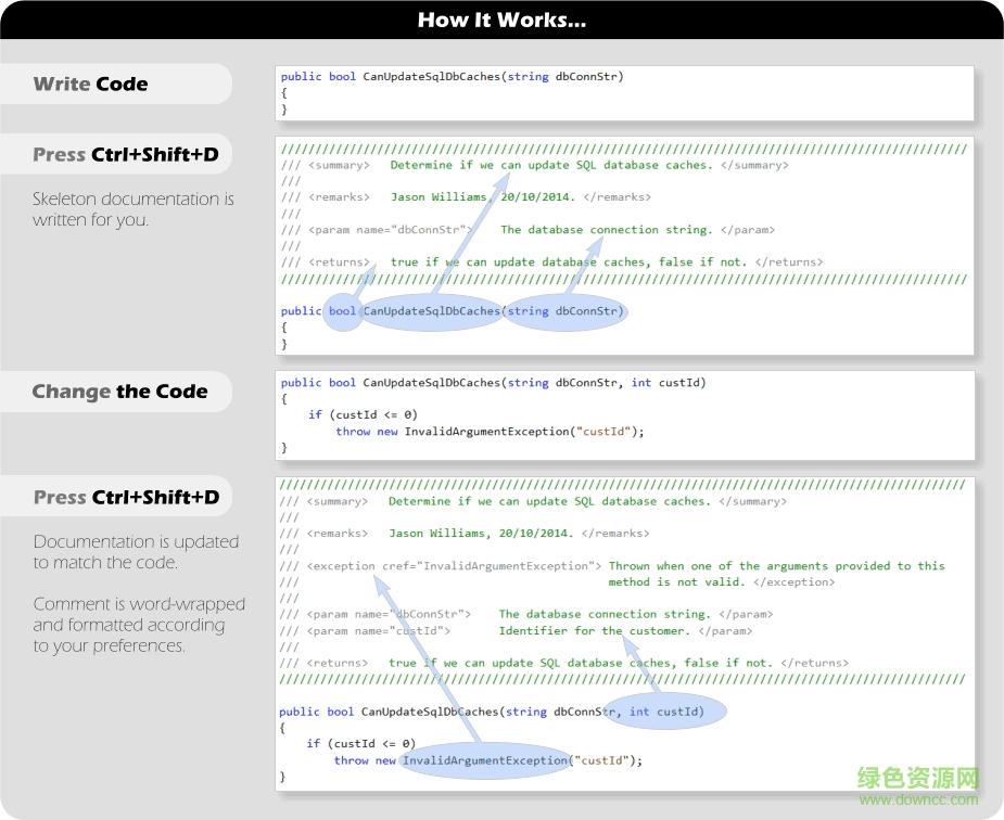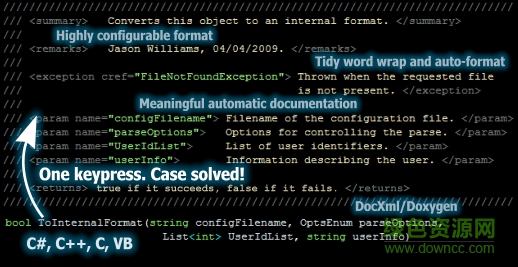 atomineer将自动生成文档明确的出发点,对所有参绿色资源网数的上下文敏感的描述,泛型类型参数,抛出的异常并返回代码,使用的上下文信息,如现有的文档相关的基类,重写方法/属性和现有参数在同一个班,并产生精确和专门为普通功能成千上万文档类和参数类型。