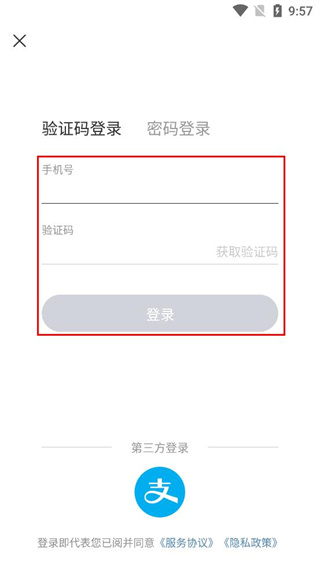 4、进入登录界面后,选择验证码登录模式,准备填写手机号及对应的验证码信息。