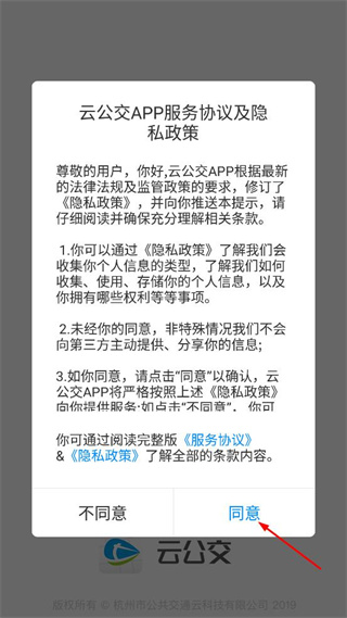 1、打开云公交APP,查看弹出的服务协议及隐私政策,点击“同意”按钮进入应用。