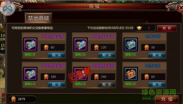 由于免费挑战禁地的次数有所提升,那么禁地积分也自然而然地增加了许多,然后就能在禁地商城‘买买买‘了。禁地商城的物品每天五点钟自动刷新一次,也可以选择免费刷新一次。物品基本是50级——80级防具宝箱和坐骑宝箱。