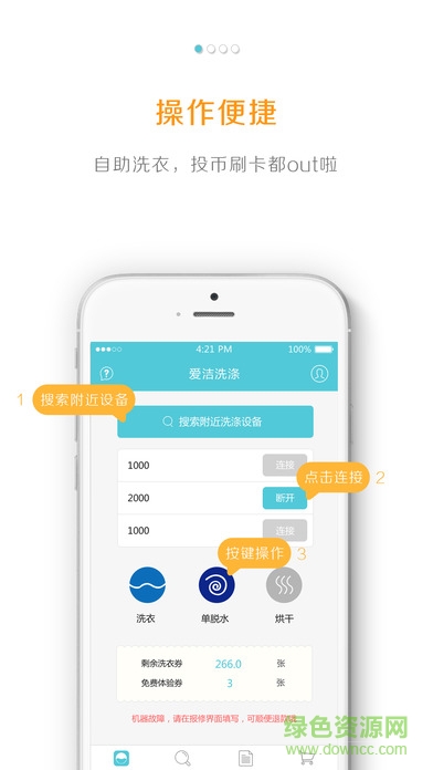 iwash安卓软件是由爱洁推出的一款自助洗衣服务手机客户端,用户可以在这里查询空暇的洗衣机设备,可以在线查看洗涤的时间,在线进行洗衣、单脱水、烘干等操作,还可以在线进行支付,非常的方便,欢迎有需要的朋友到绿色资源网下载使用!